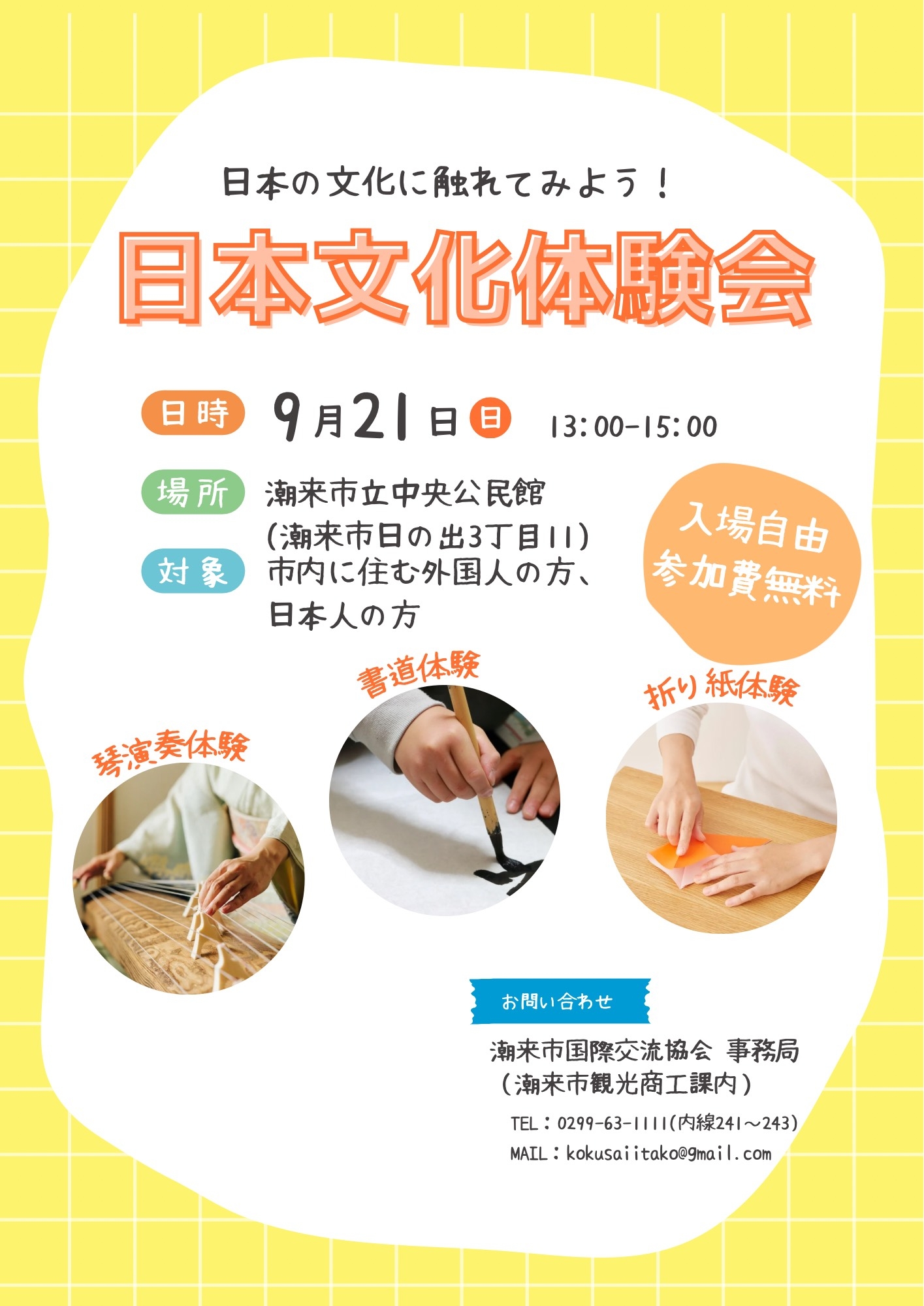 9月21日(日) 潮来市立中央公民館 大ホールにて、「日本文化体験会」を開催しました。講師として、箏演奏の高橋先生、潮来市文化協会書道部、潮来高校JRC部の皆様にご協力いただき、会場に箏の演奏、書道、折り紙が体験できるブースを設けました。参加者は講師の先生にやさしく教えてもらいながら、箏の音を奏でたり、習字で好きな字を書いたりしました。